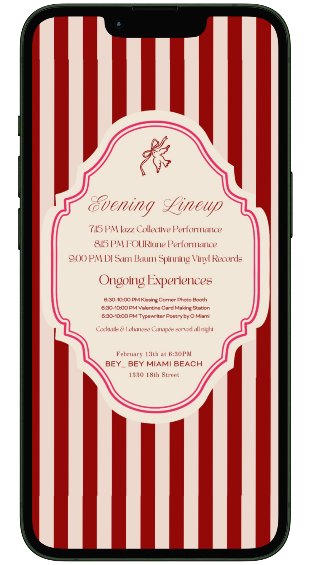 Cada elemento visual, desde las invitaciones hasta la señalización, fue pensado para reflejar la esencia romántica y cálida del evento. También creamos la página web, newsletters, página de tickets, invitaciones digitales, materiales impresos y gift bags, cuidando cada detalle para que el evento se sintiera coherente, especial y ayudara a recaudar fondos para la misión de YMU: ofrecer educación musical gratuita a los colegios de Miami.